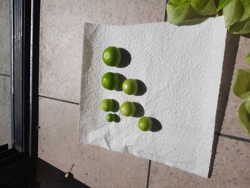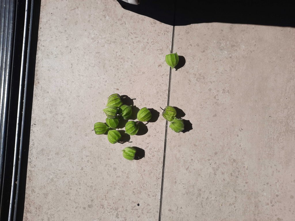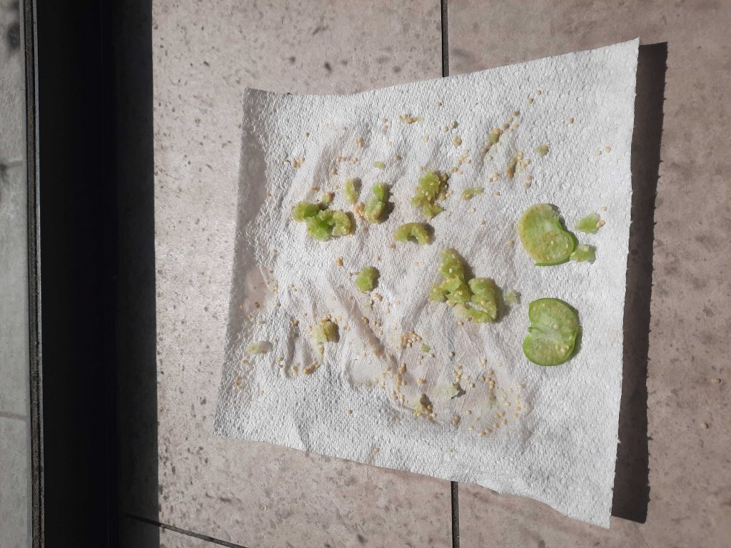 Harvested the last of the tomatillos and some of the gooseberries and storing the seeds on a napkin for next season.
