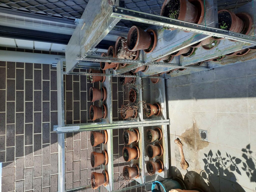 assembled and built a 3rd and 4th set of shelves and put terracotta 17cm pottery planters on them. balcony now has 7 X 30cm pots, and 4 shelving units with 48 X 17cm terracotta pots.